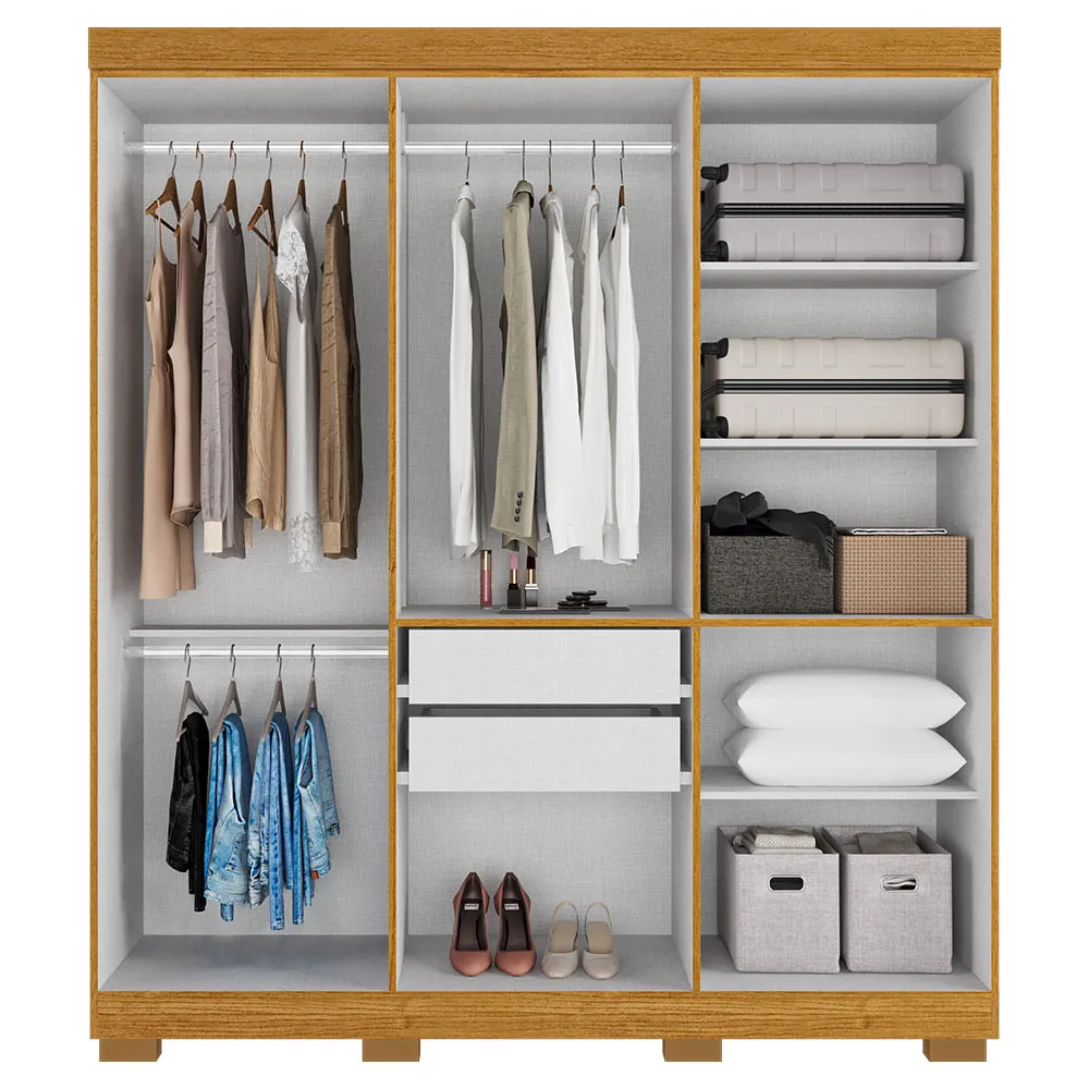 Com um amplo espaço interno, prateleiras, cabideiros em aluminio, além de duas gavetas espaçosas que deslizam suavemente graças às corrediças telescópicas, este guarda-roupa é o parceiro perfeito para manter suas roupas e acessórios organizados com a máxima facilidade.